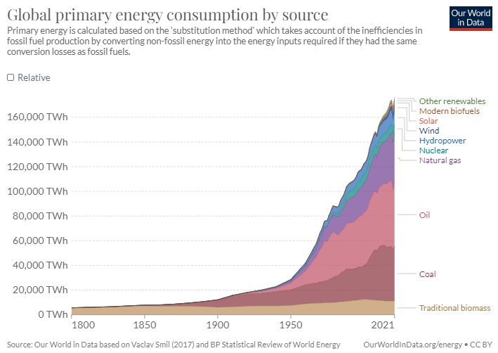 - Oil, coal and gas alone account for 75% of our primary energy consumption (and 67% of our final energy consumption in “direct” fossil fuel consumption, and 80% including fossil fuel electricity). ↩︎