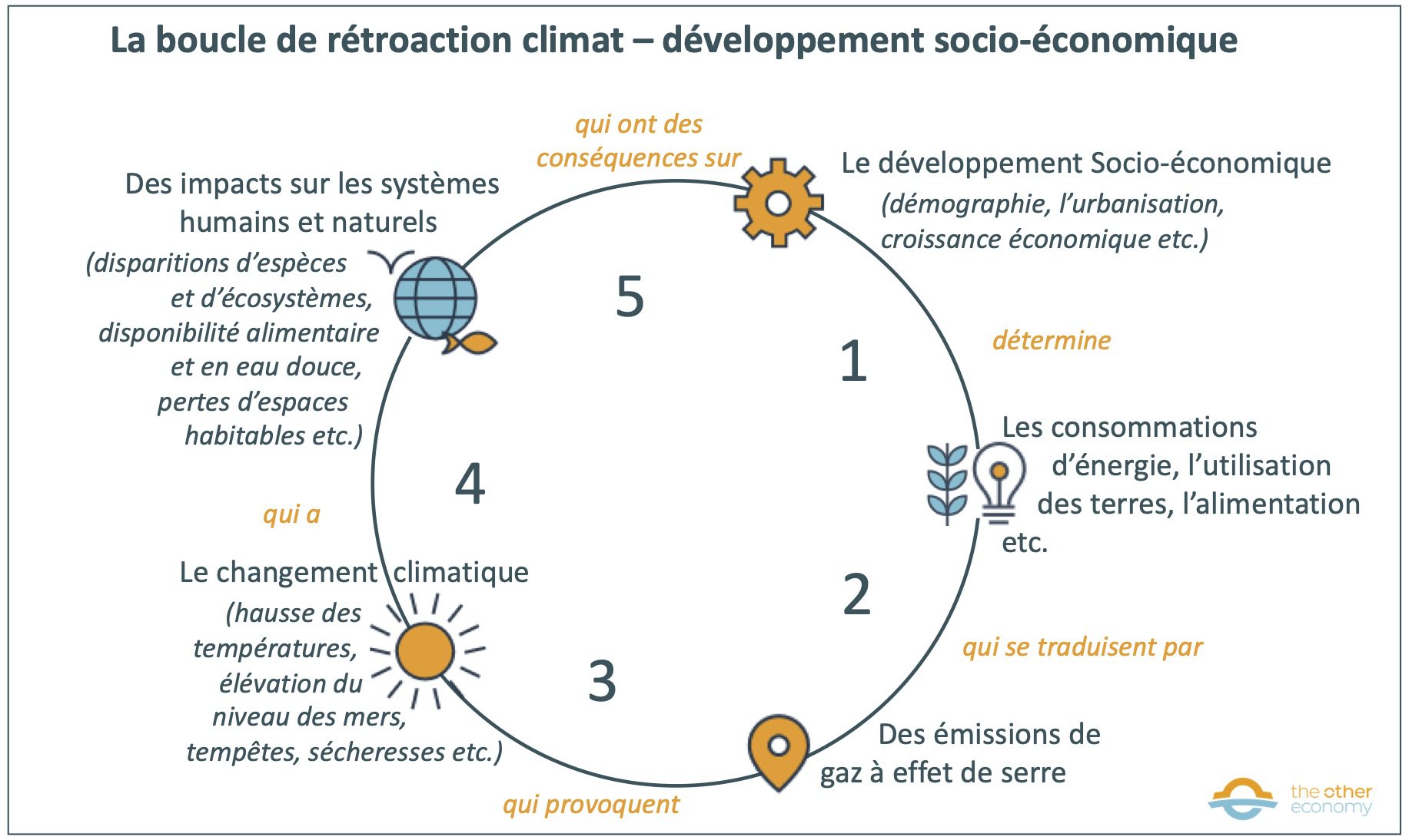 Human activities lead to energy consumption and land use. This results in greenhouse gas emissions, which in turn cause climate change in its many manifestations (e.g. global rise in temperatures, changes in rainfall patterns, melting of continental glaciers, changes in ocean currents, increased heat waves and storms, etc.). Climate change in turn has repercussions on human beings and natural systems, and ultimately on socio-economic development.