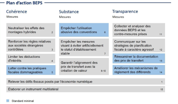 The BEPS project aims to combat tax evasion, improve the consistency of international tax rules and ensure a more transparent tax environment. It comprises 15 actions to be implemented by the more than 140 countries and jurisdictions that have signed up to the BEPS Inclusive Framework (see box). For four of these actions, minimum standards must be implemented.