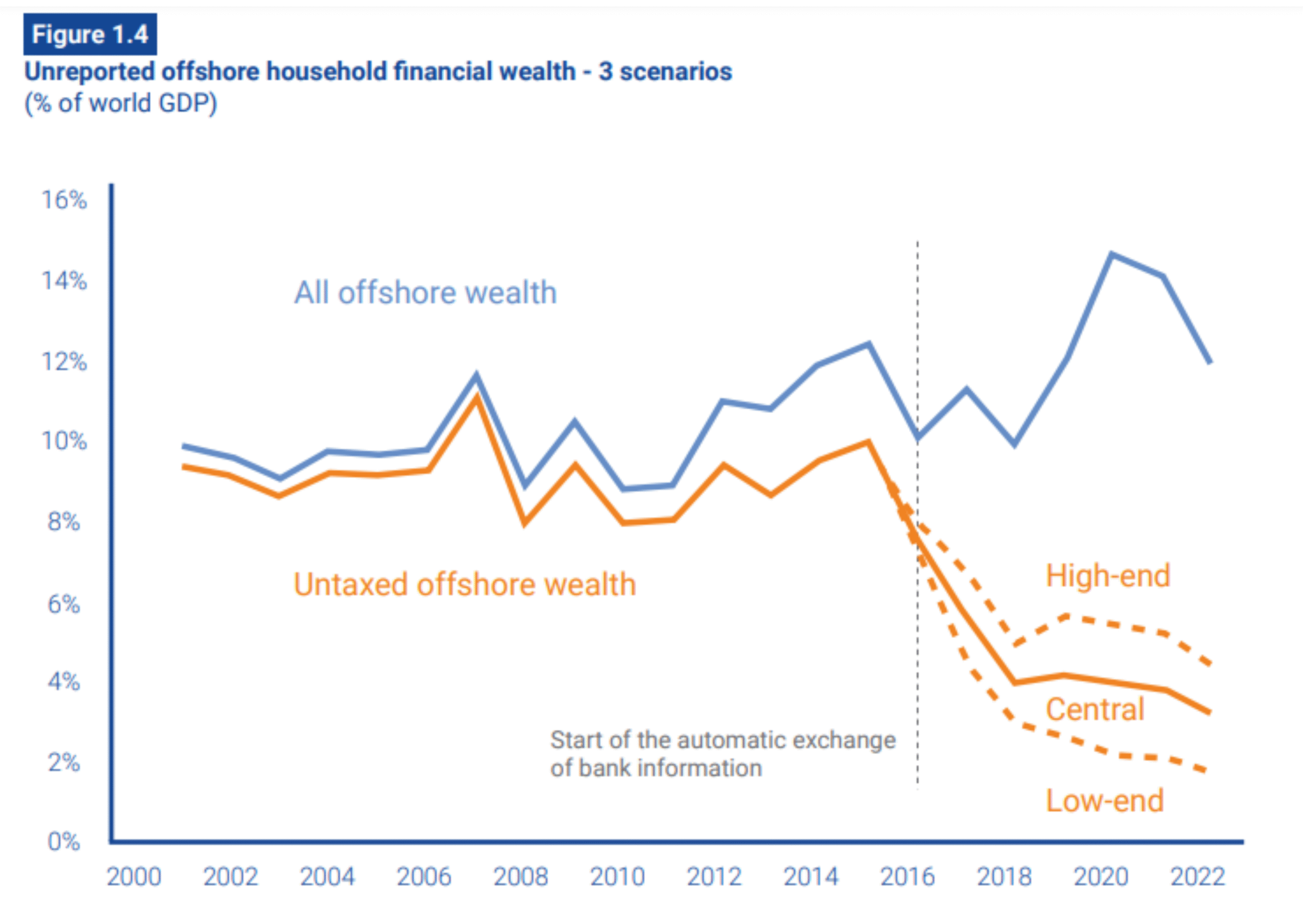 In 2022, according to the Global tax evasion report 2024 the financial wealth held by households abroad amounted to around $12,000 billion, equivalent to 12% of global GDP.