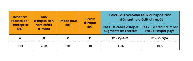 Tax credits are not considered as a reduction in tax paid, but as an increase in revenue. This choice has consequences for the reality of the minimum rate at 15%, as shown in the example below.