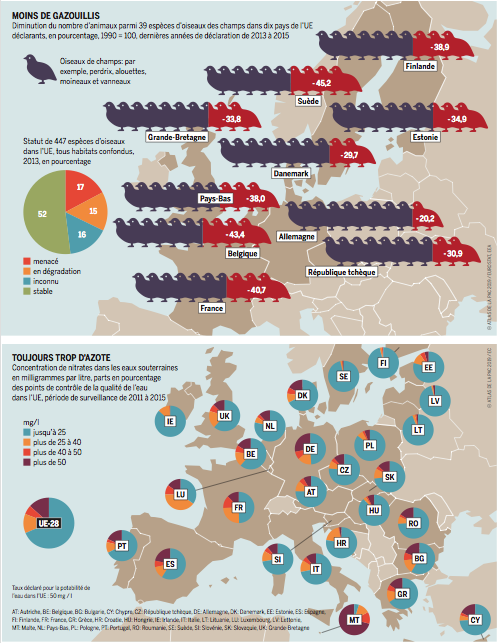 Despite these various reforms and their desire to better integrate environmental considerations into agricultural production, the environmental situation is hardly improving: pesticide use remains high, water and air quality are barely improving, and biodiversity in rural areas continues to deteriorate. A study by the MNHN and the CNRS shows, for example, that farmland bird populations have collapsed by a third in 15 years, at a faster rate than forest or urban bird populations.