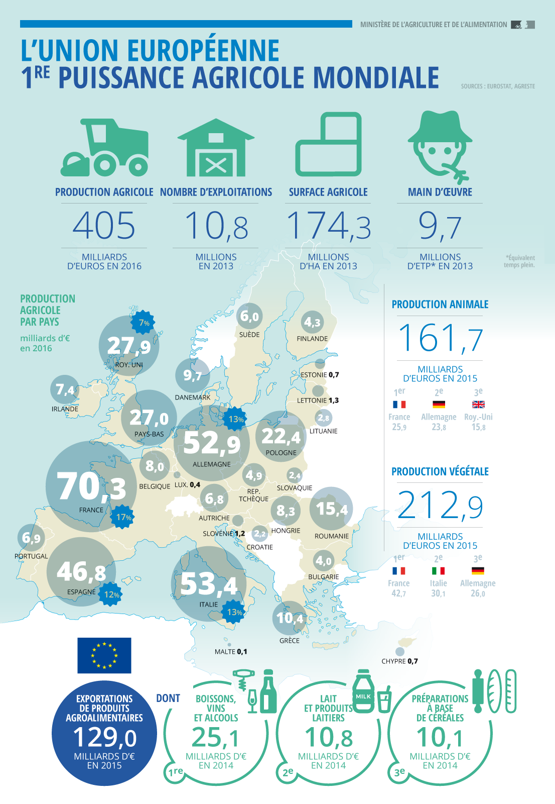 The European Union has become the world’s leading agricultural power. The Union’s exports represented 129 billion Euros in 2015 (raw and processed agricultural products). Europe has become a major exporter in many sectors, particularly wines, dairy products and cereals.