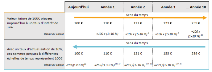To discount a sum is to consider this operation in the other direction, backwards in time: what do flows perceived in the future represent in today’s terms?