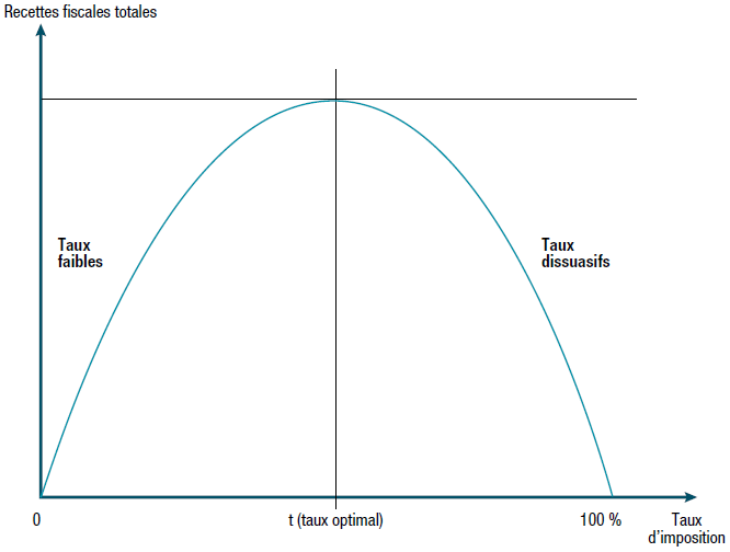 This curve reflects the idea that for most taxes, and in particular income and corporate taxes, there is an “optimal” rate which maximizes tax revenues, and beyond which any increase would diminish said revenues. This rate is necessarily greater than 0%, as there is no tax revenue without taxes, and less than or equal to 100% (since it is assumed that if the tax rate were greater than 100%, nobody would want to pay to work). Laffer translates this idea with his famous bell-shaped curve: when the tax rate is “to the left of the hump”, raising taxes increases tax revenues; conversely, “to the right of the hump”, lowering taxes has the surprising effect of increasing tax revenues! The underlying argument is that tax increases can act as a disincentive to work and the income generation that goes with it, ultimately reducing government revenues.