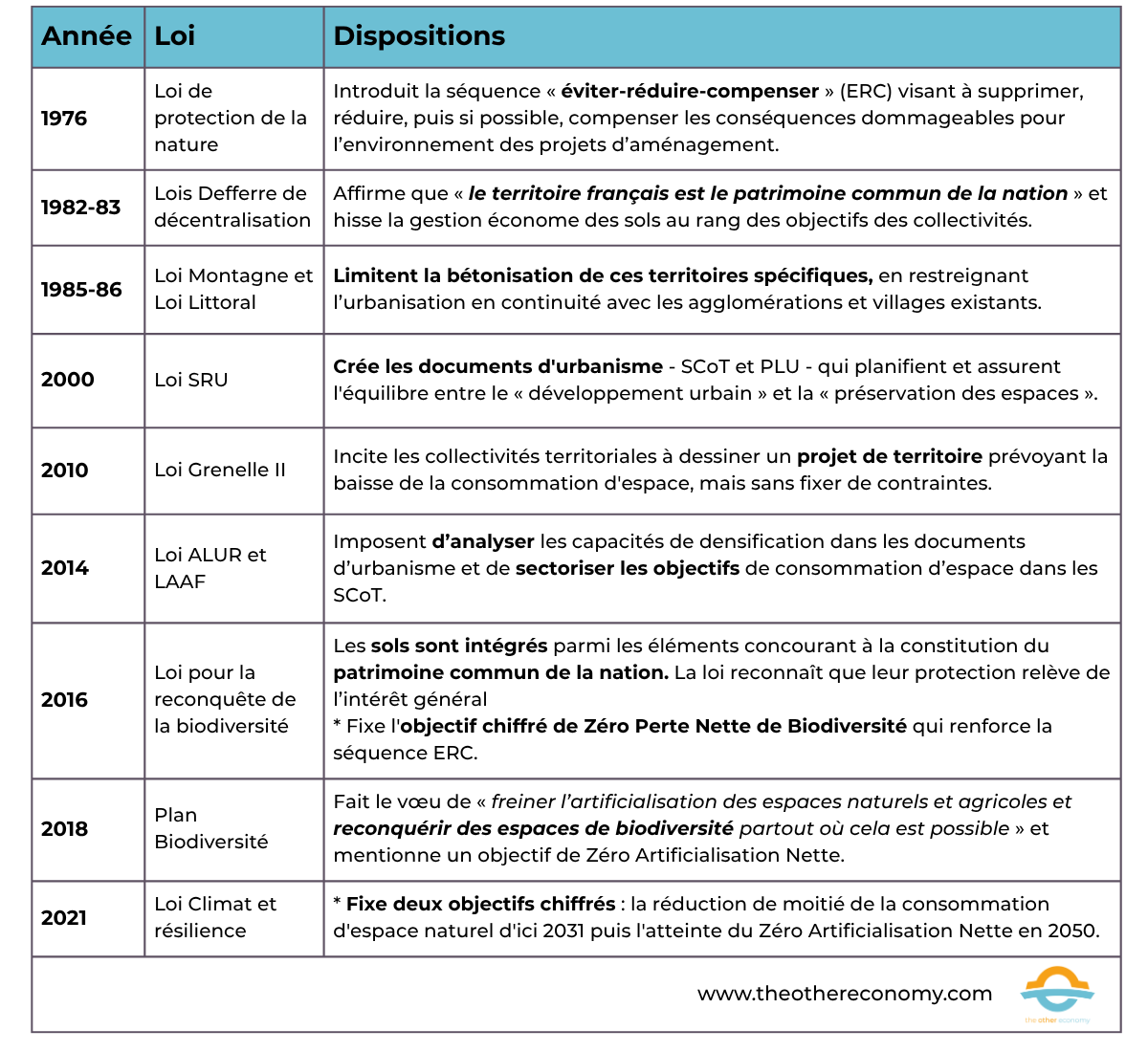 This long process of progressive soil protection in French law culminates in the inclusion of the ZAN objective in the Climate and Resilience Act of August 22, 2021, which follows on from the work of the Citizens’ Climate Convention 7 .