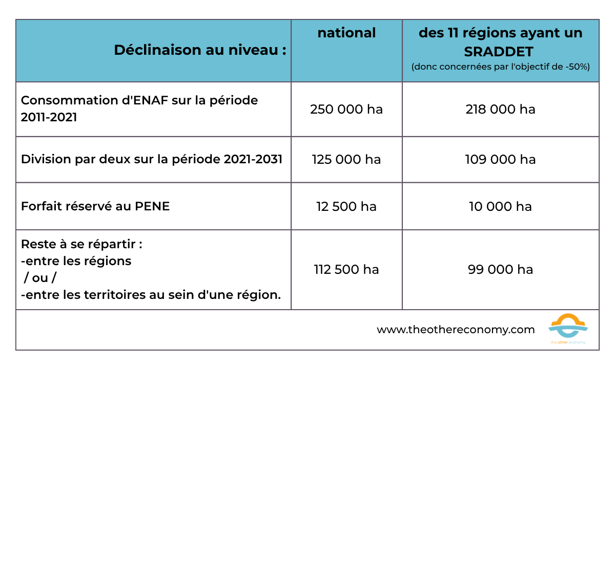 Reading: At national level, halving the consumption of ENAF over the 2021-2031 period compared to 2011-2021 is equivalent to allowing the consumption of around 125,000 ha. Of this envelope, the law provides for 12,500 ha (10%) to be set aside for PENE, before the remainder (around 112,500 ha) is distributed between the regions.