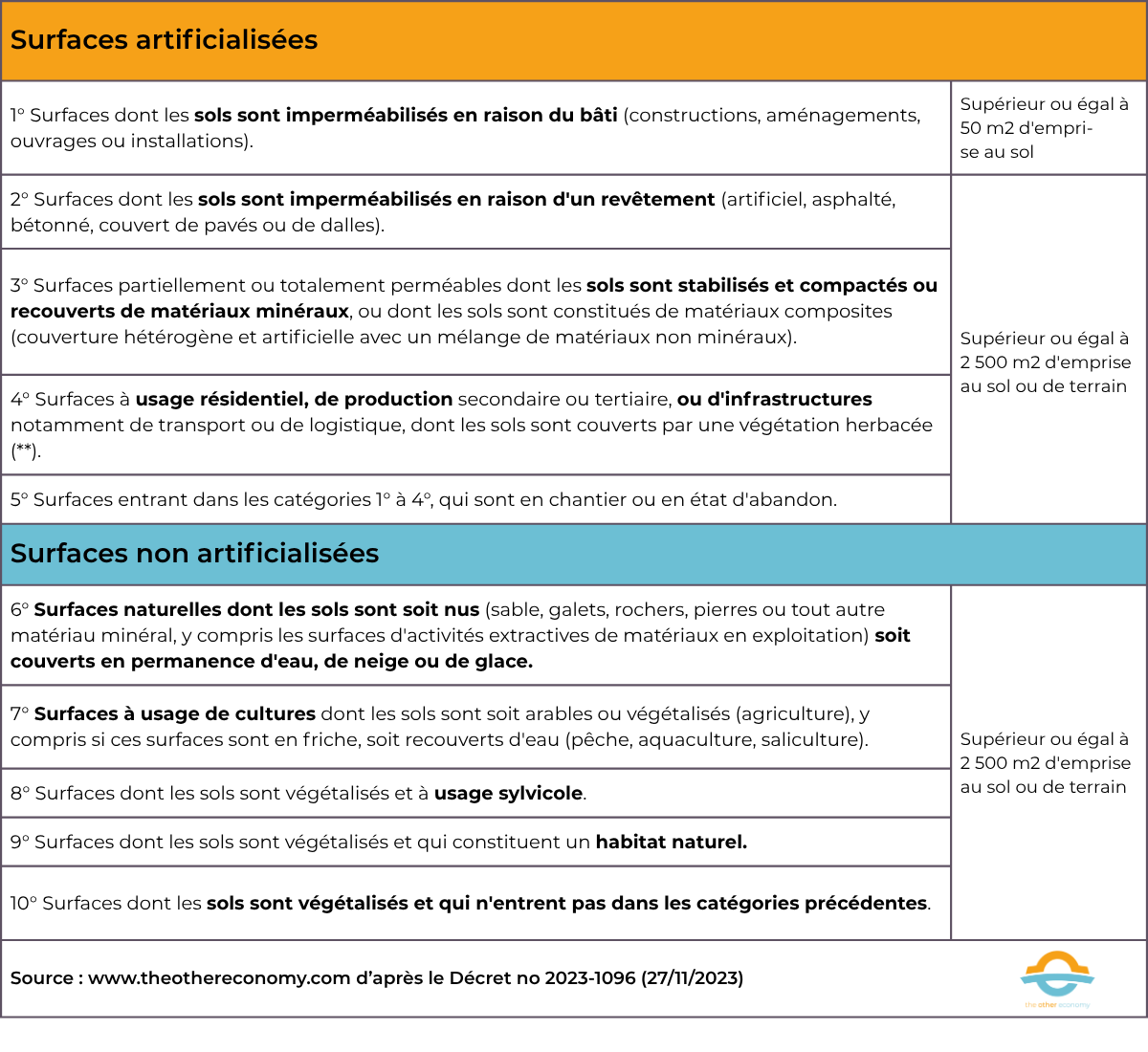 This distinction does not, of course, cover all possible scenarios: a “nomenclature” for soil artificialisation was published in a decree in April 2022. This was contested and appealed, before being reworked and published in a modified version in November 2023, following the promulgation of the ZAN law in July 2023 (see section 2.3 on the nomenclature of soil artificialisation).