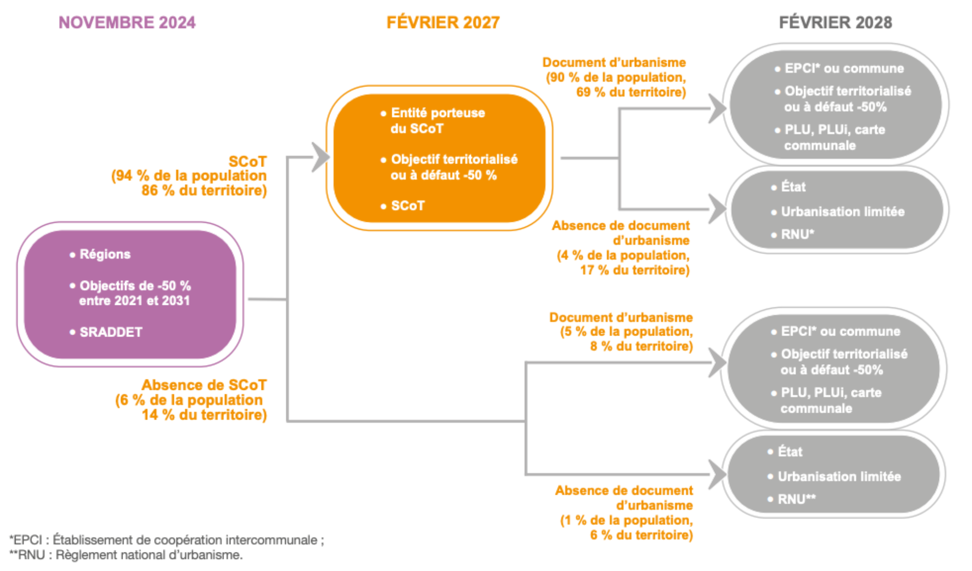 Reading: SCoTs will have to incorporate the territorialized targets (or, failing that, a target for halving space consumption) set out in regional SRADDETs by February 2027. Local authorities with urban planning documents (PLU, PLUi or carte communale) must then incorporate these objectives into their urban planning documents before February 2028.