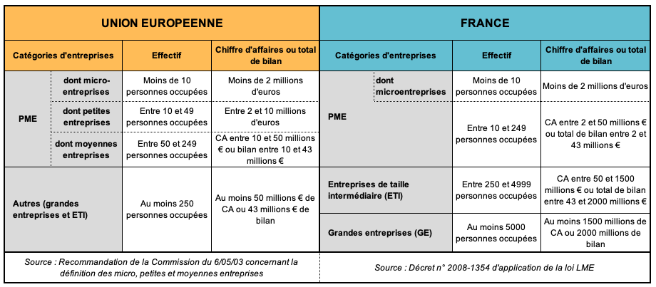 Source In a 2003 Recommendation, the European Commission defined thresholds for categorizing companies according to headcount and financial data (sales or balance sheet total). France transposed the Commission’s recommendations in a decree implementing the 2008 Law on the Modernization of the Economy.