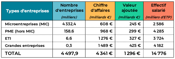 In 2021, the 4.5 million companies in France’s non-agricultural and non-financial market sectors will generate 1,296 billion euros in added value and employ 14.7 million full-time equivalent (FTE) workers, bringing the total number of jobs in France to around 30 million.